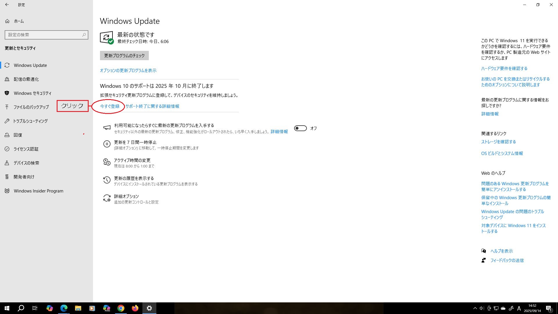 Windows Update の画面で、下記のように 今すぐ登録 が表示されていればOKです。